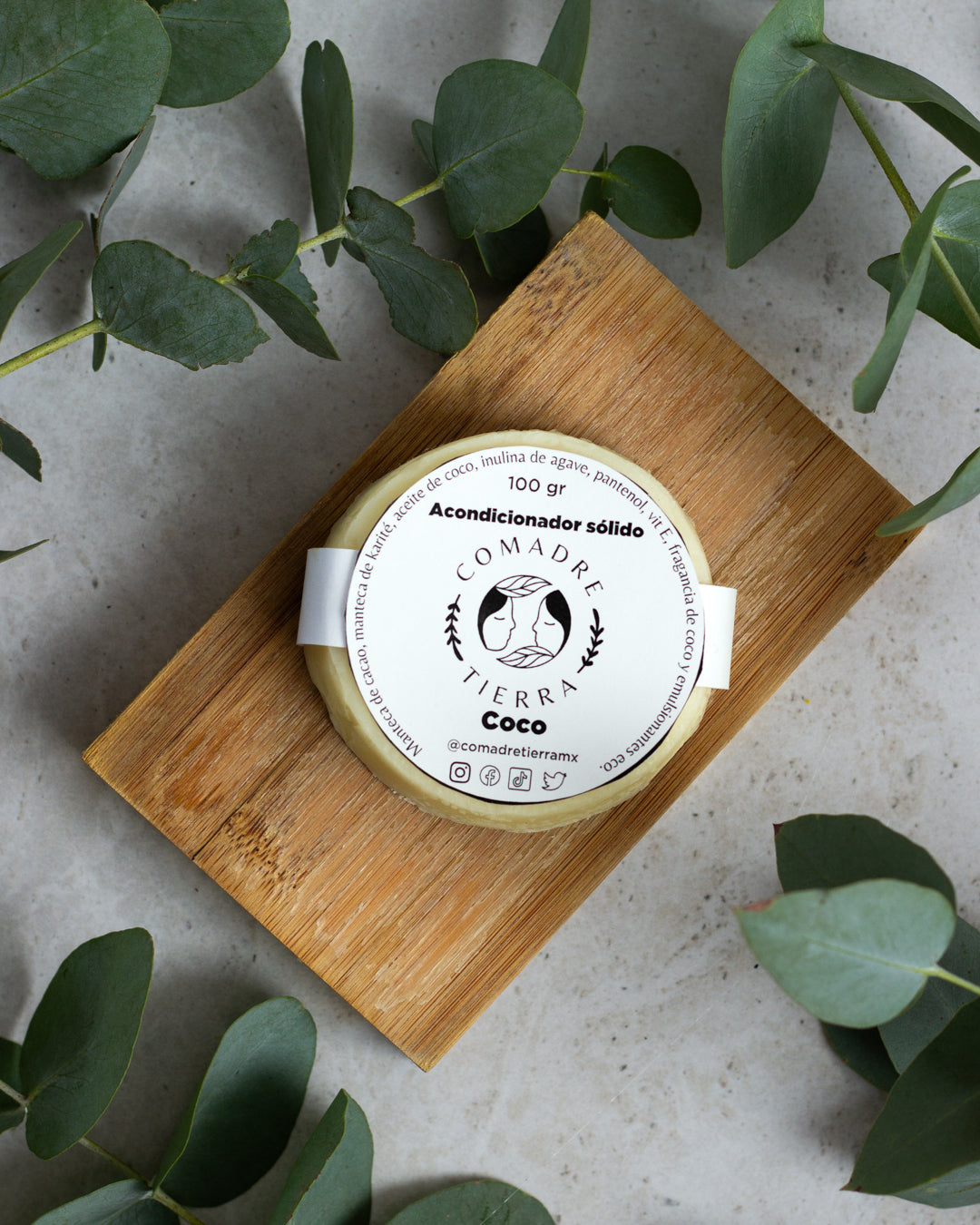 Acondicionador sólido de coco elaborado con ingredientes naturales y basado en plantas.