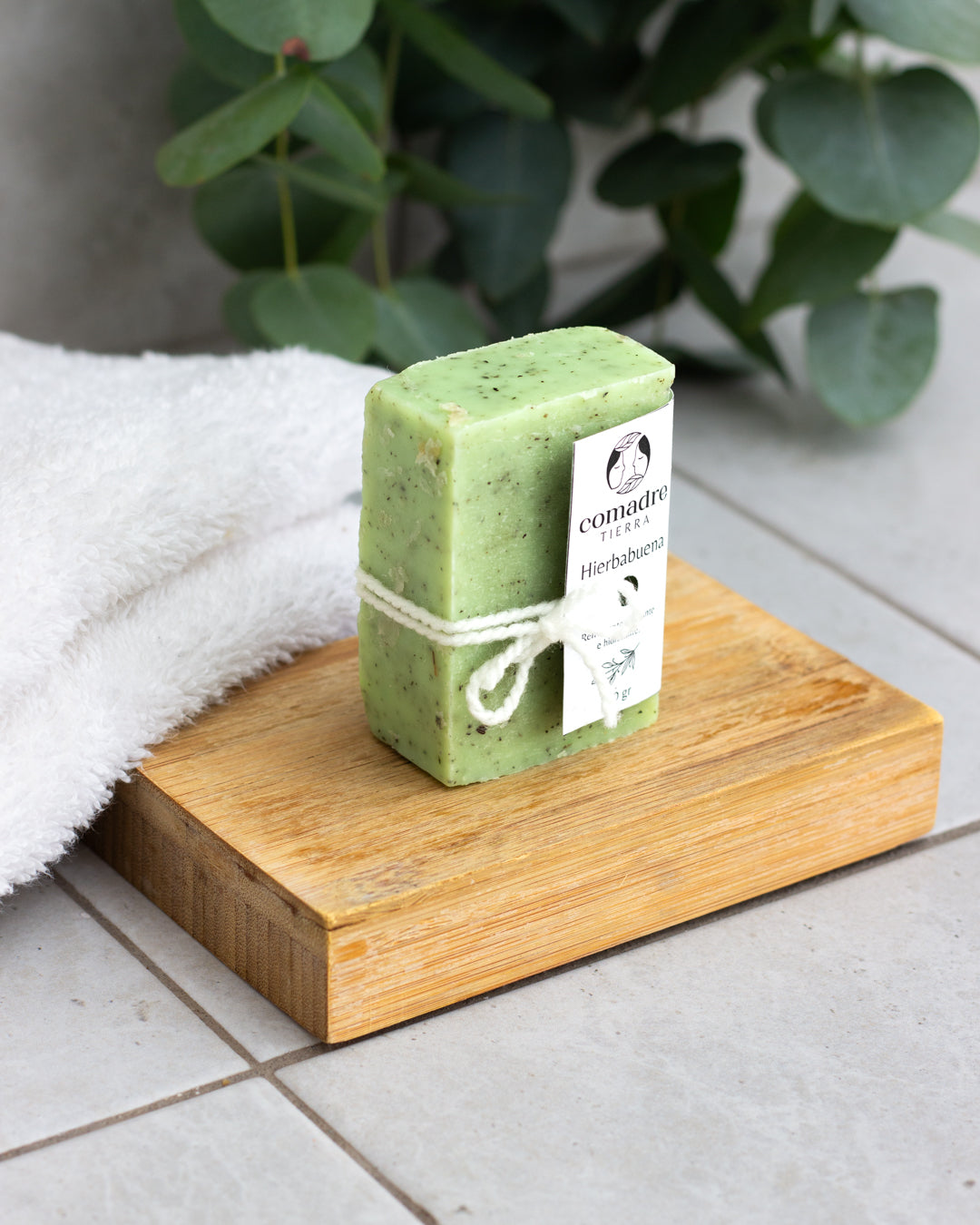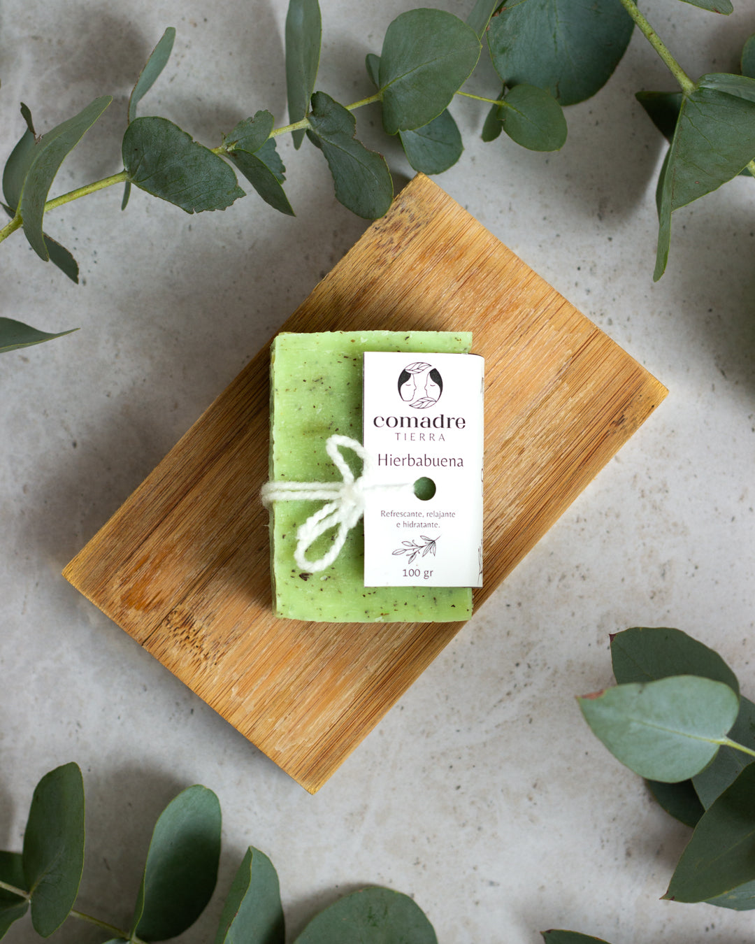 Jabón de hierbabuena de uso corporal elaboradoras con la técnica milenaria de saponificación en frío a partir de aceites y mantecas vegetales y activos de origen natural.