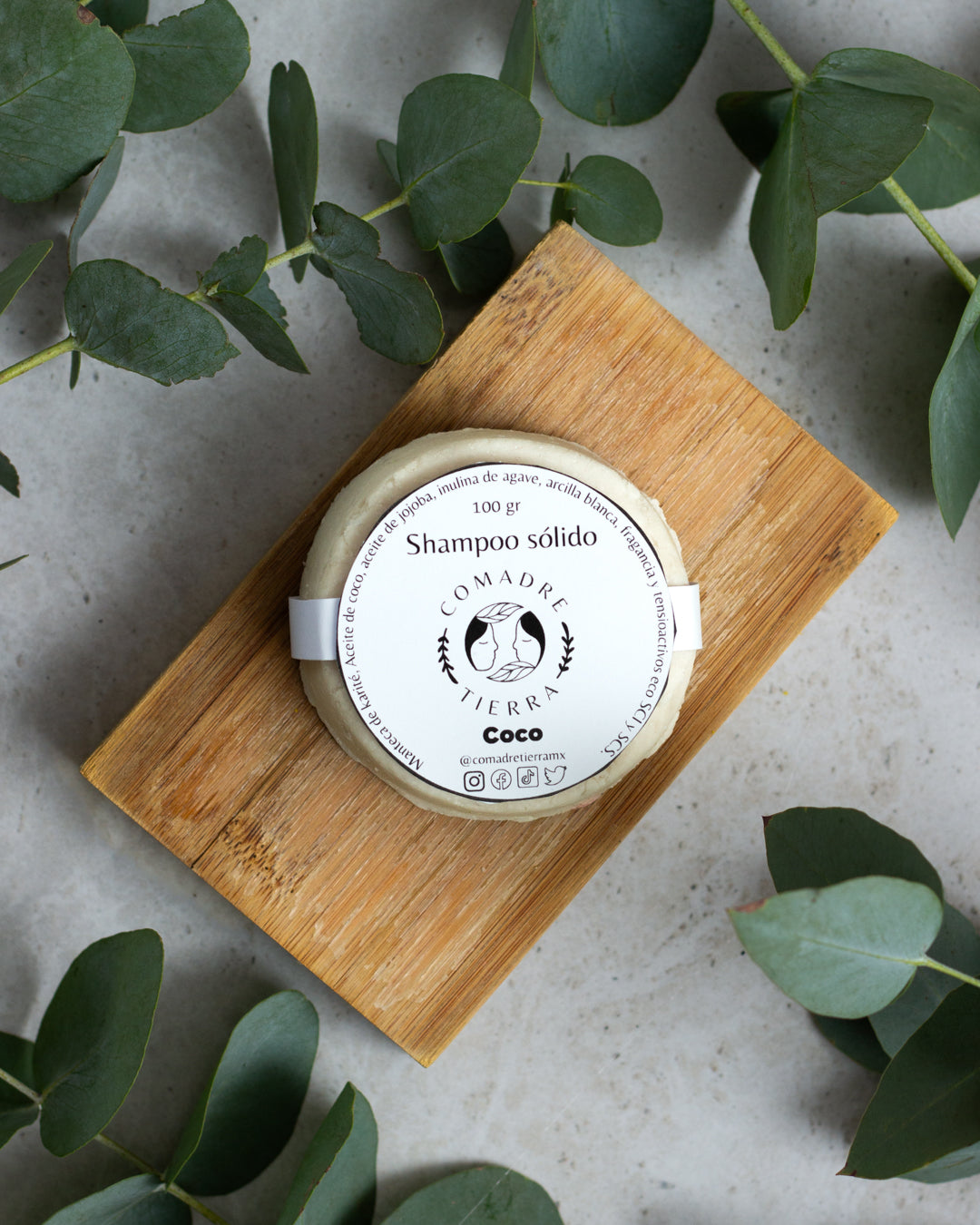 Champú sólido de coco elaborado con ingredientes naturales y basado en plantas.