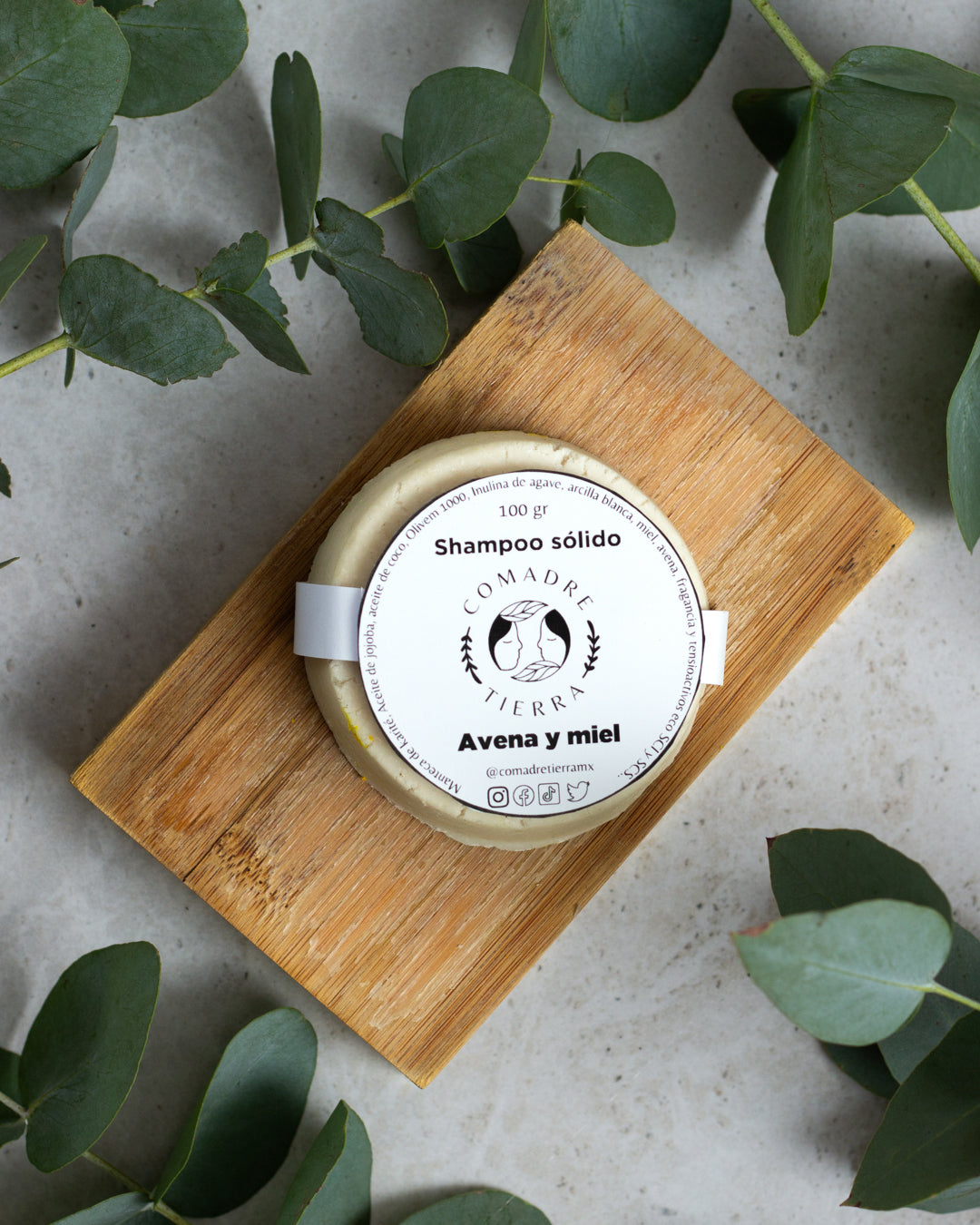 Champú sólido de avena y miel elaborado con ingredientes naturales y basado en plantas.
