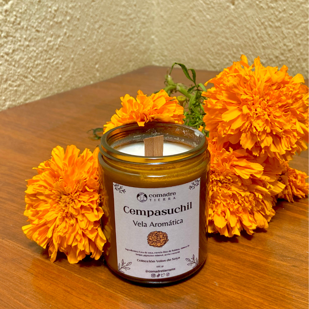 Velas aromáticas de cera de soja en vaso de vidrio tono ámbar. Contenido neto: 195 gr.